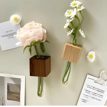 แจกันแก้วโชว์ดอกไม้แม่เหล็กติดตู้เย็นทำจากไม้เนื้อแข็งไฮโดรโพนิก